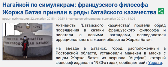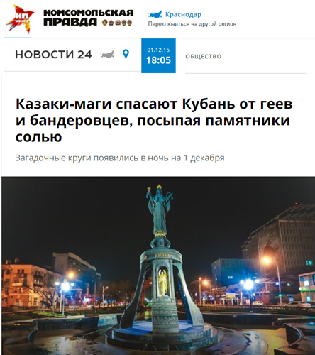С декабря 2015 года на юге России, судя по заголовкам региональных, федеральных и даже зарубежных сайтов, происходили странные вещи. Некие «Новые казачьи маги» в Краснодаре очертили главные памятники солевыми кругами, спасая город от геев, бандеровцев и турок. Ровно два года назад, 21 декабря 2015 года, казаки из Батайска приняли в свои ряды философа Жоржа Батая. Краснодарский клуб библиотекарей «Перун» вместо чучела зимы сжег книги Генри Миллера, выступив против «генитальных подснежников» и за ядерную зиму вместо «черной весны».