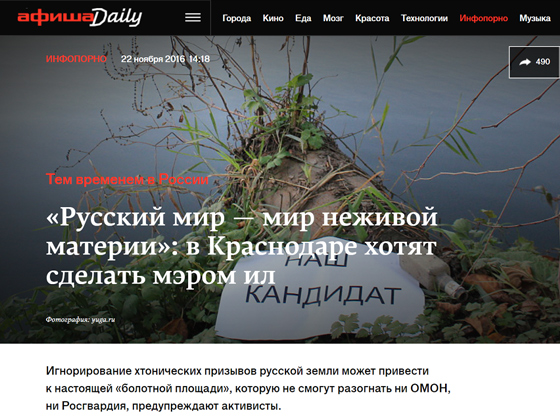 Год назад на AroundArt довольно подробно и понятно описали смысл деятельности краснодарских мистификаторов. В статье речь шла о присвоении идеологического языка и доведении его до абсурда, о захвате образов и контрабанде смыслов на территории политических противников. Своими новостями, которые многие принимают за правду, они дискредитируют образы разнообразных консерваторов-охранителей, превращая их уже в совсем ополоумевших гоблинов. А официальные комментарии и опровержения только еще сильнее раскрашивают этот абсурд.