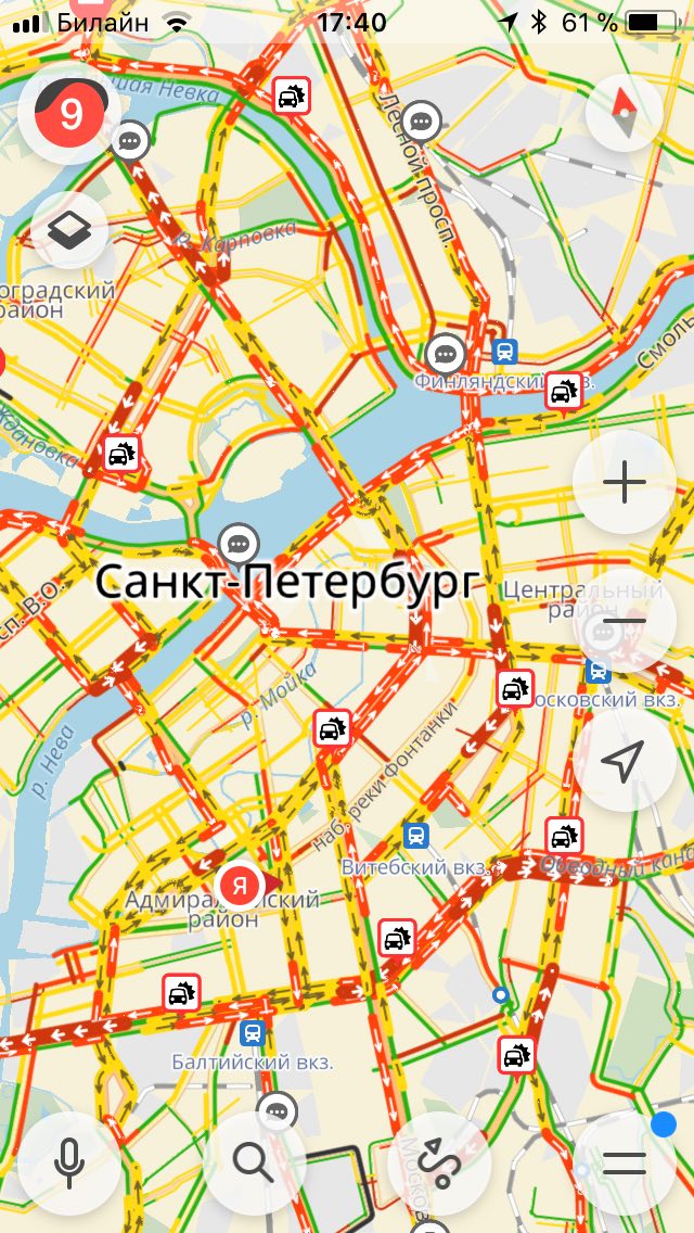 Пробки на дорогах в Петербурге, согласно сервису «Яндекс.Карты», достигли девяти баллов из-за сильного снегопада. Особенно крупные заторы скопились в центре города.