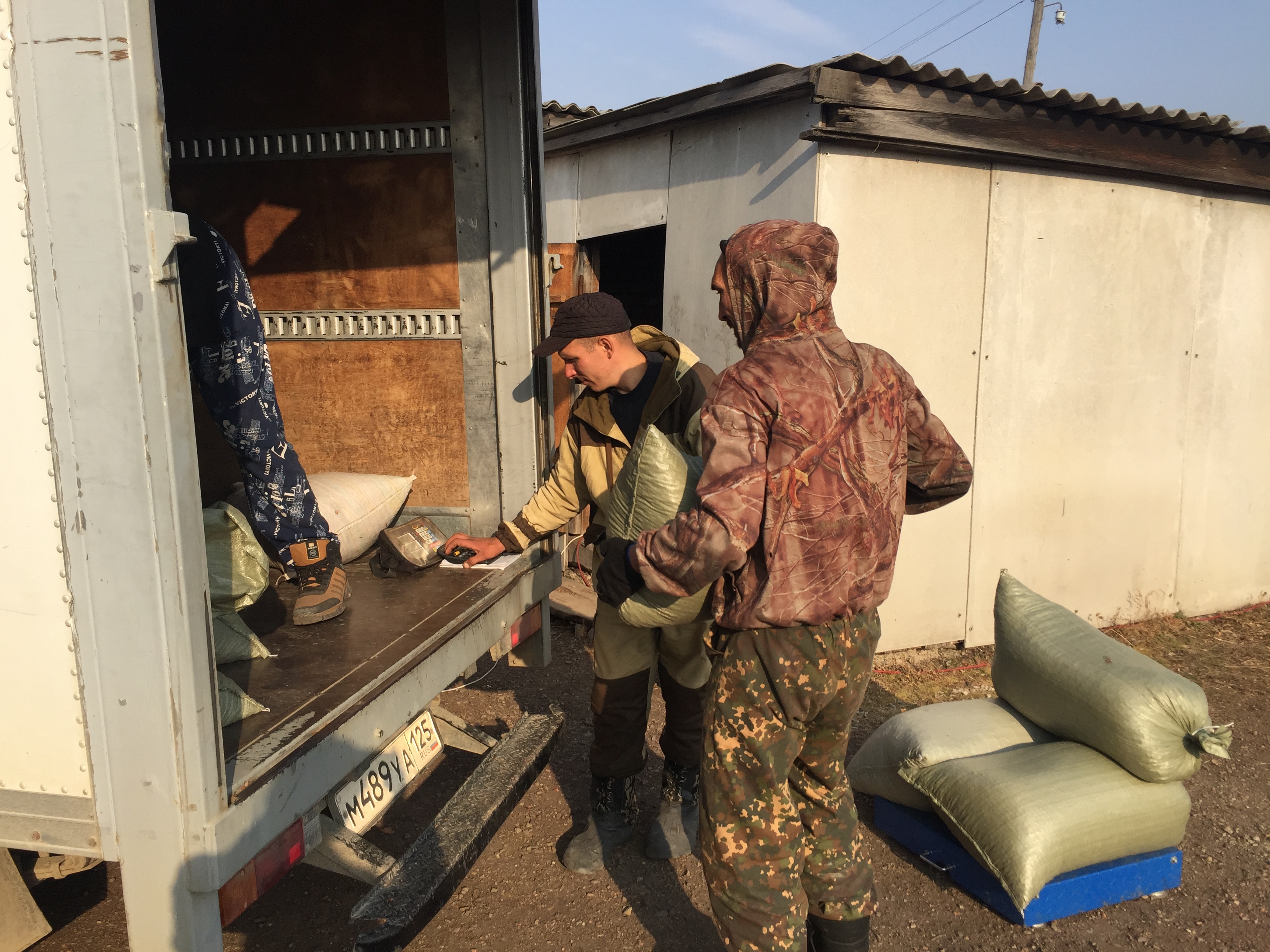 Спустя несколько минут подъезжает грузовик. В кузове – весы и специальный "щуп", чтобы проверить качество товара. Мешок – на весы, с весов – в кузов грузовика. Водитель рассчитывается с работниками. Зовут его Руслан Горбачёв, представляется "человеком, оказывающим услуги населению". В машине, по его словам, примерно 300 килограммов.