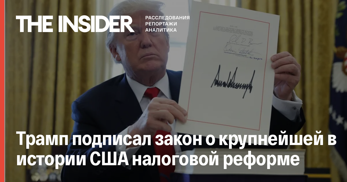 Президент США Дональд Трамп подписал закон о крупнейшей в истории страны налоговой реформе. Общие налоговые сборы с граждан должны сократиться на 1,5 триллиона долларов, пишет Reuters.