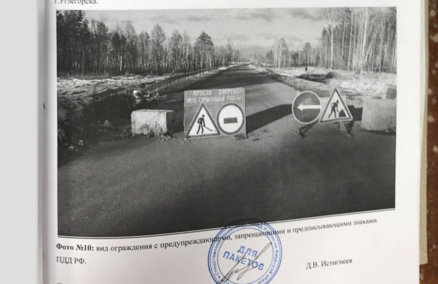 Первый протокол осмотра места происшествия следователь полиции Углегорска Корясова и сотрудник ГИБДД Истомин составляли с 02:00 до 04:30 22 октября. К документу прилагается схема места происшествия и фототаблица. Однако ни на снимках, ни на схеме не видно никаких запрещающих и предупреждающих знаков или бетонных блоков. Второй протокол подписан уже более высокопоставленным следователем — сотрудником следственной части следственного управления УМВД по Амурской области Истигнеевым. В этом документе, составленном спустя 15 часов после аварии, говорится, что на въезде на опасный участок запрещающие знаки все-таки есть. Видны бетонные блоки и знаки и на фототаблице; при этом вместо 3.2 (въезд запрещен) — белого кирпича на красном фоне — там изображен черный кирпич на белом фоне, а вместо 4.2.2 (объезд препятствия слева) — белой стрелки на красном фоне, расположенной под углом 45 градусов — такая же стрелка, но расположенная перпендикулярно дороге. Каких-либо других документов непосредственно после аварии следователь составлять не стал.