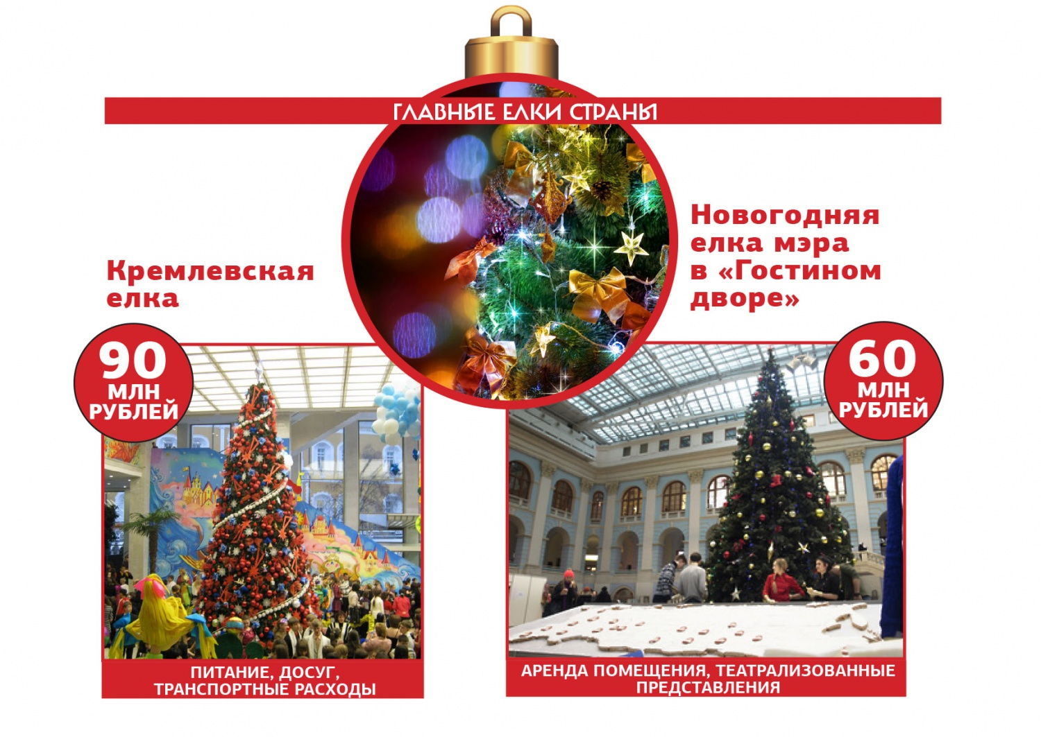 Кроме сладостей детям подарят и билеты на традиционные новогодние представления. Самое главное из них — Кремлевская елка, на которую каждый год приезжают несколько тысяч детей со всех регионов. Организаторы праздника — управделами президента, столичное правительство и Московская Федерация профсоюзов, указано на сайте мероприятия. Полные затраты на его проведение неизвестны. Соответствующих закупок московских властей и Федерации профсоюзов не обнаружено, а расходы УДП касаются только размещения, питания и досуга посетителей (на эти цели его дочерняя структура потратила 61,4 млн руб., перевозки детей и сопровождающих лиц, прибывших в город, и непосредственно доставки в Кремлевский дворец главной ели страны (все транспортные услуги обойдутся в 17 млн руб.).