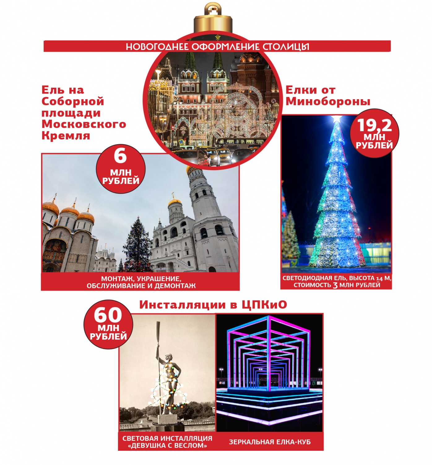 Подарки детям — далеко не все новогодние траты госорганов и госкомпаний. Администрации городов украшают улицы, а учреждения, банки и предприятия — фасады своих зданий. Главный заказчик по этой части — Москва, в прошлом году, по подсчетам «Медузы», потратившая на оформление столицы «в итальянском стиле» около 7 млрд руб. Только за световые конструкции в виде фужеров с шампанским, украсившие 64 фонаря на Тверской, город выложил из своего бюджета более 143 млн руб.