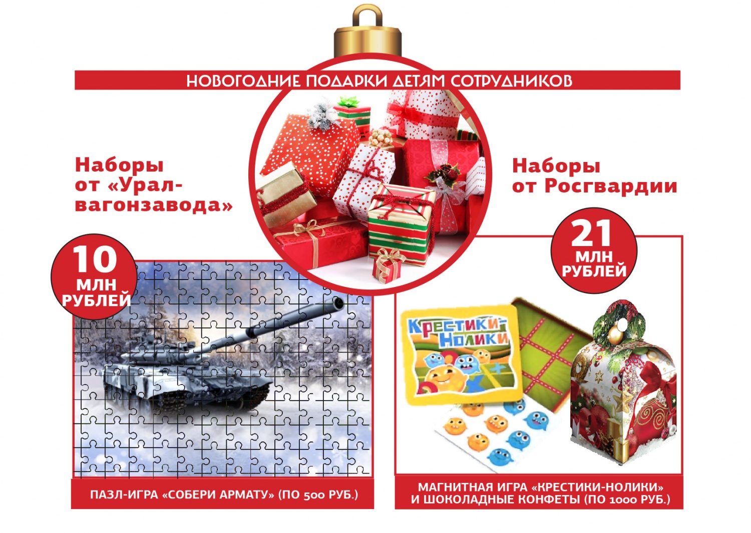 Уложилось в 1000 руб. за подарок ФГУП «Охрана» Росгвардии: 20 923 ребенка сотрудников вневедомственной охраны получат по чемоданчику из микрогофрокартона, в котором они найдут 1,3 кг шоколадных конфет (в том числе «Мелодию любви» и «Тайну мгновения») и развивающие вложения 4 видов. Одно из них — магнитная игра «Крестики-нолики», где крестики и нолики заменены «игровыми мордашками в виде смайликов». «Дизайн каждой мордашки должен быть индивидуальный и отображать разные эмоции (радость, удивление, хитрость и т.д.)», — подчеркивается в техническом задании.