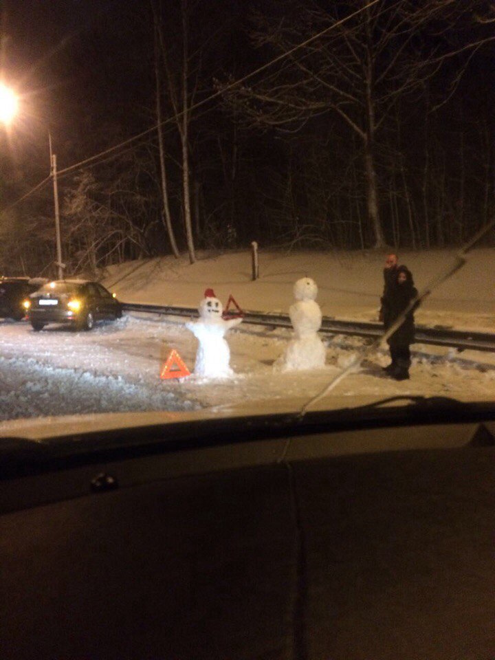 На Выборгском шоссе попавшие в аварию водители слепили снеговиков, пока ждали сотрудников ГИБДД. Фотографии появились в паблике «ДТП и ЧП».