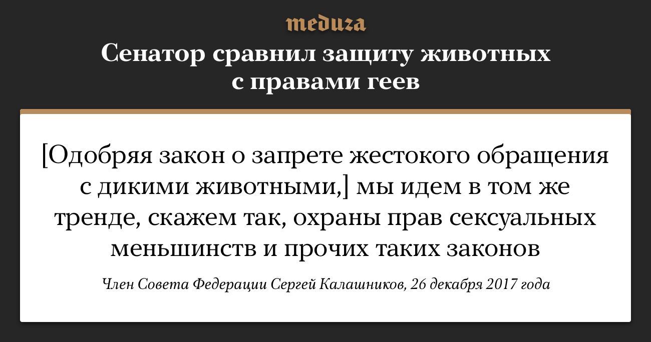Соавтор отклоненного законопроекта — спикер нижней палаты парламента Вячеслав Володин. «Ситуация, при которой поощряется живодерство, для нас неприемлема», — заявил он. И сослался на поддержку Владимира Путина.
