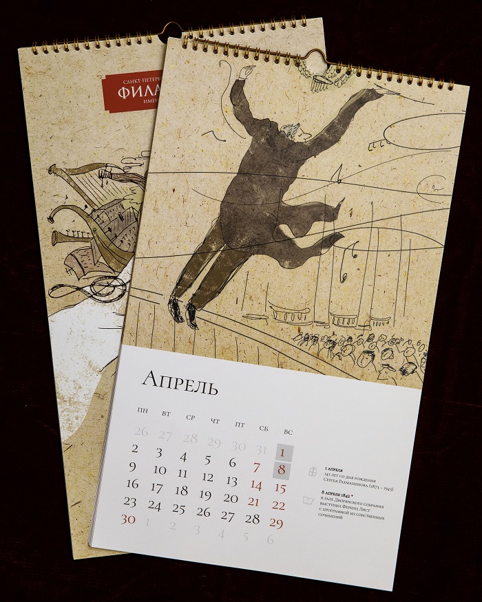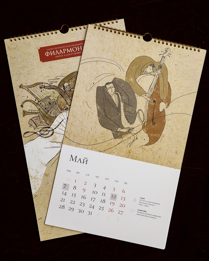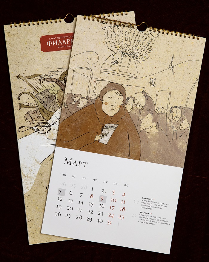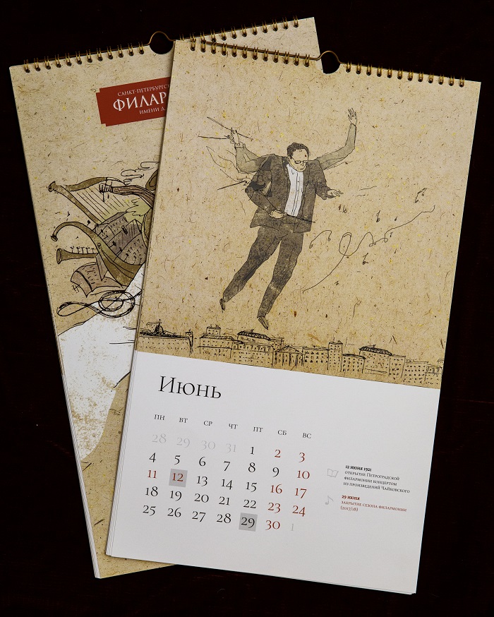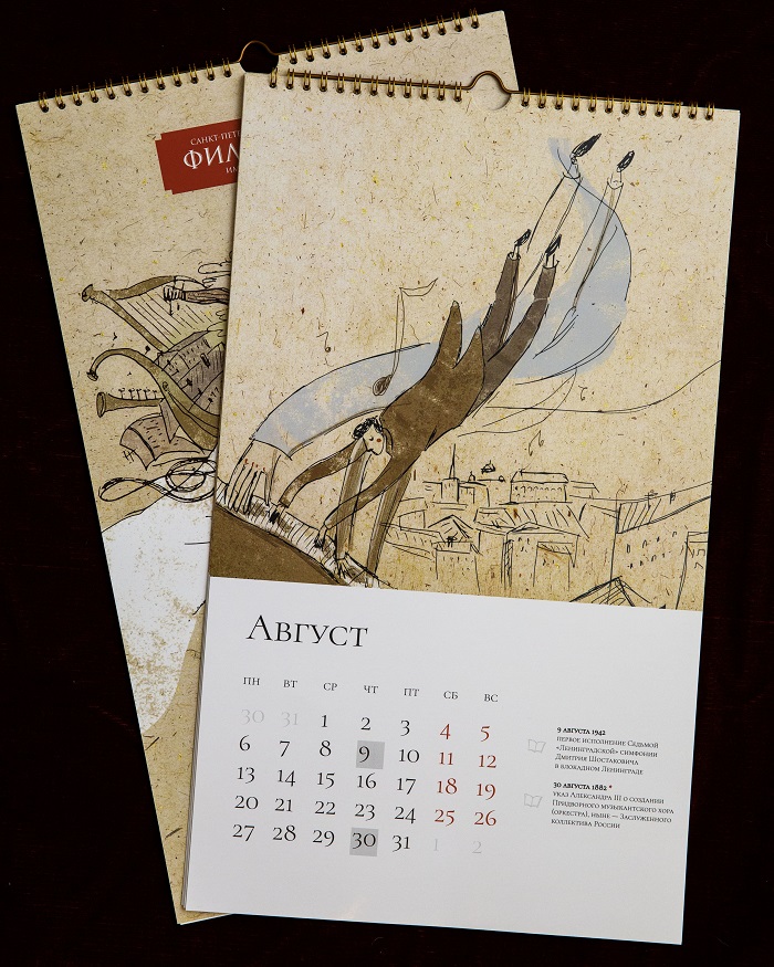 Помимо календарей продаются сумки с надписью «Люблю филармонию», а также сувенирные закладки, чехлы для мобильных телефонов и открытки. Автор рисунков — художница Александра Конакова.