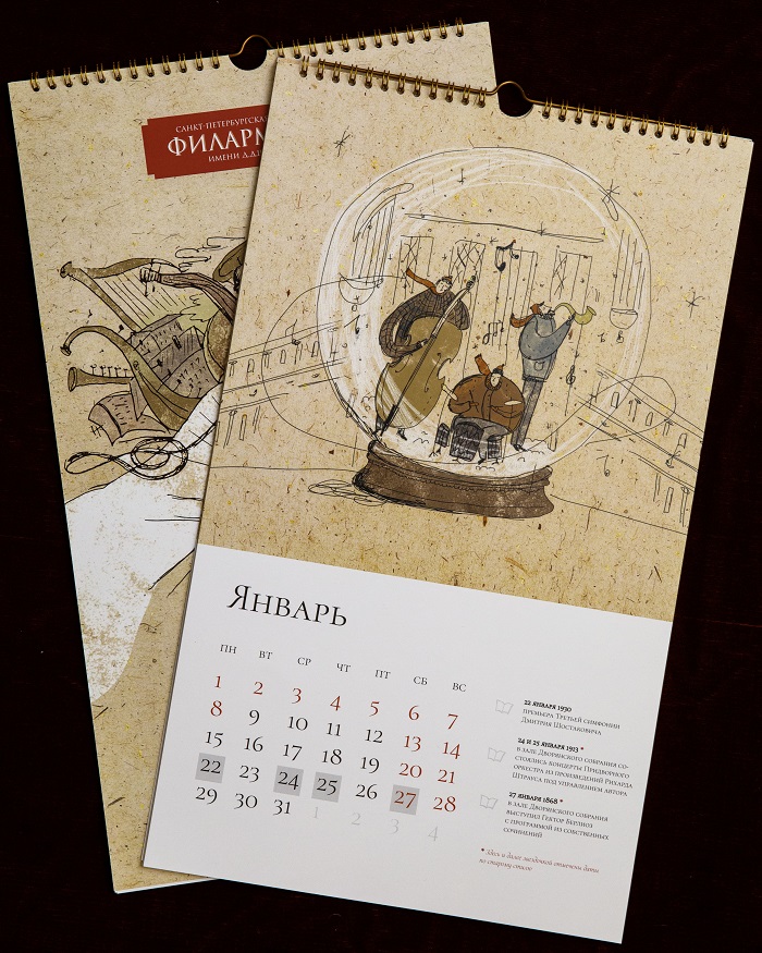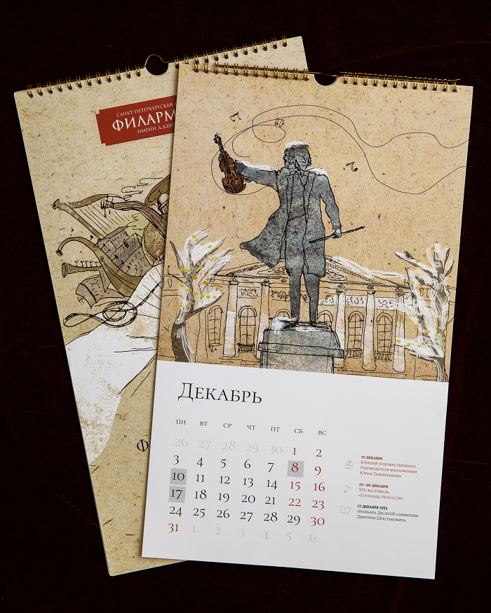 Филармония к Новому году выпустила календарь с изображениями петербургских музыкантов. Среди рисунков — портрет Дмитрия Шостаковича, чье имя носит филармония.