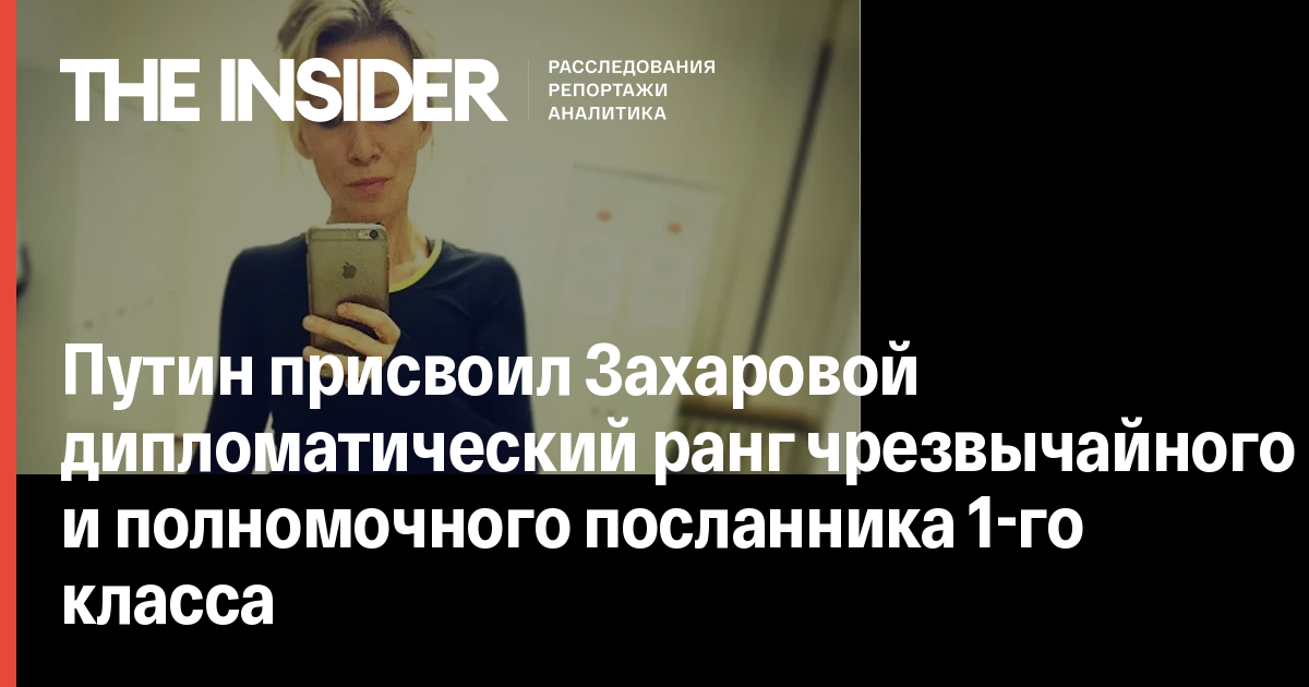 «Присвоить дипломатический ранг Чрезвычайного и Полномочного Посланника 1 класса Захаровой Марии Владимировне — директору департамента информации и печати министерства иностранных дел Российской Федерации», — говорится в указе.