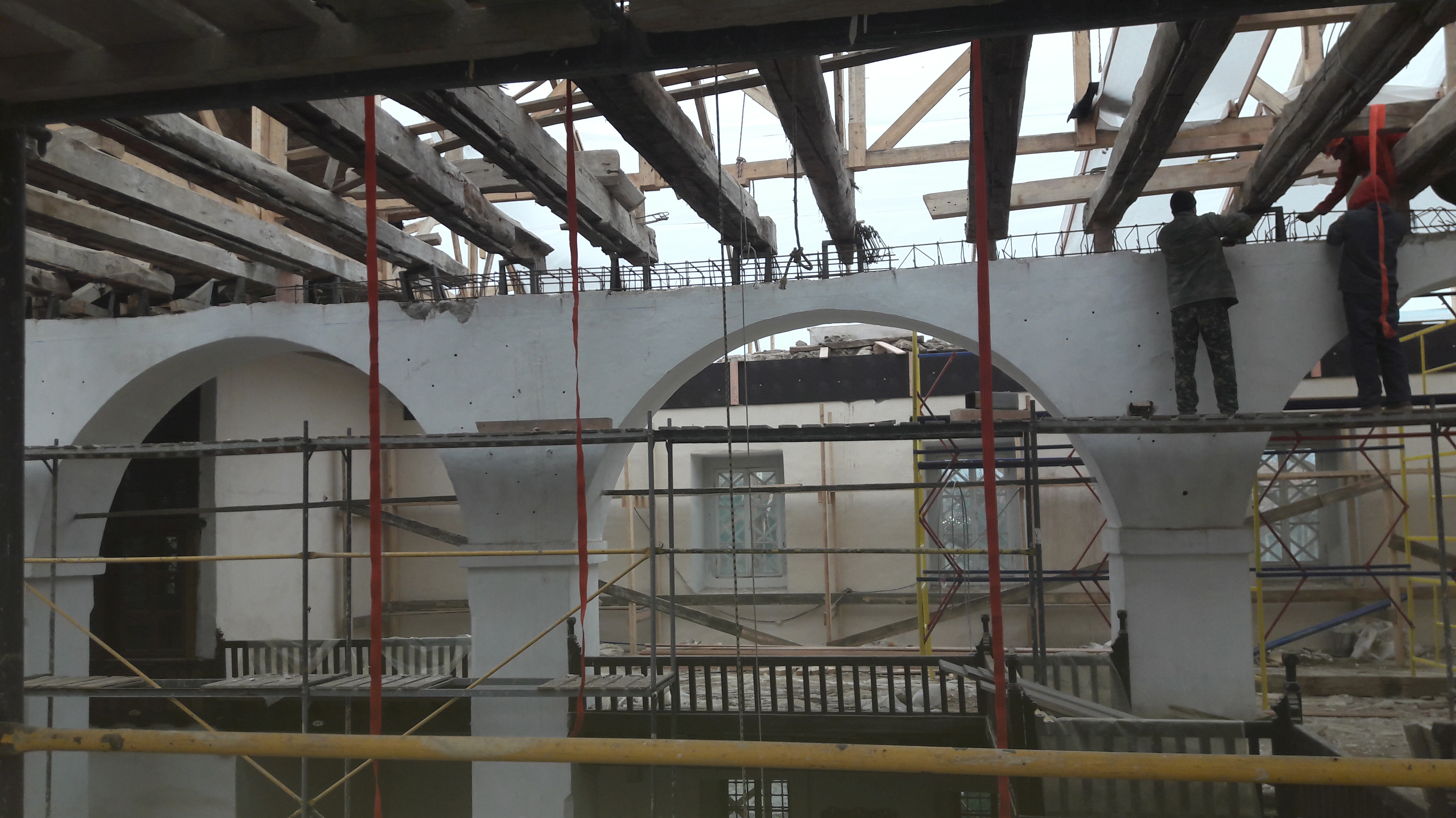 Вокруг главного корпуса дворца российские работники возводят тяжелый металлический каркас, сверху его планируют накрыть навесом. Он должен простоять пять лет, пока будет продолжаться реконструкция. Эксперты опасаются, что под тяжестью конструкции может просесть грунт. Реставраторы, работавшие над дворцом 15 лет, зарегистрировали петицию, в которой просят остановить строительство.