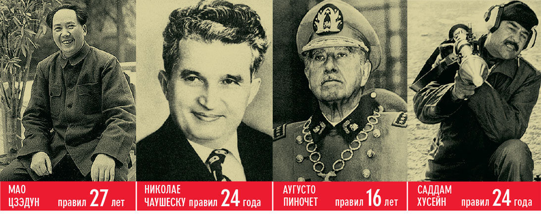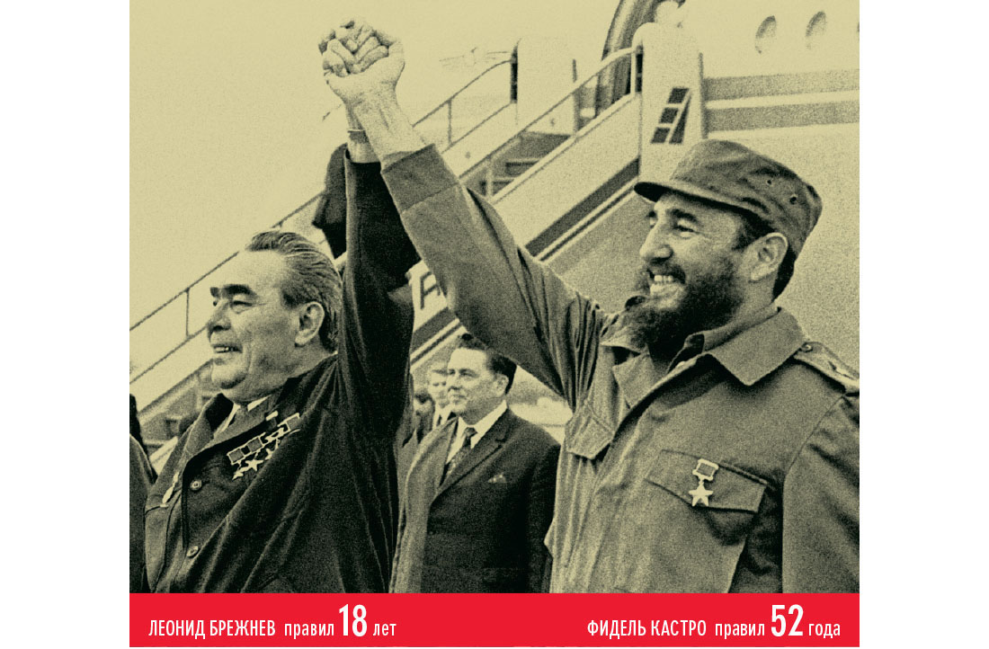 24 года — цифра не уникальная. Особенно если речь идет о сроке правления диктатора. Только в новейшей истории ровно такое количество лет у власти находились «красный Дракула» Чаушеску (1965–1989) и Саддам Хусейн (1979–2003). Объединяет их и общий печальный итог — оба в конце концов были казнены. Среди руководителей СССР дольше правил только Сталин: с 1922-го, когда стал генеральным секретарем ЦК ВКП(б), и до смерти в 1953-м. Однако полностью сосредоточить власть в своих руках «вождь народов» сумел только после разгрома бухаринского «правого уклона» в 1929 году. Если с этого момента считать время его абсолютной власти, то получатся те же 24 года. Эпоха Брежнева на этом фоне выглядит не так впечатляюще: всего 18 лет, с октября 1964-го по ноябрь 1982-го. Столько же правил в ГДР попавший в конце концов под суд Эрих Хонеккер (1971–1989). Чуть дольше находились у власти коммунистические диктаторы в некоторых других, «братских» и не очень странах. Мао Цзэдун — 27 лет (1949–1976), либеральный на фоне других коллег по соцлагерю Иосип Броз Тито — 35. Недаром Коба ему завидовал. Рекордсменом среди коммунистических правителей оказался Фидель Кастро, официально пробывший на посту лидера кубинской революции с 1959 года до весны 2011-го, когда по состоянию здоровья был вынужден окончательно передать власть своему брату Раулю*.