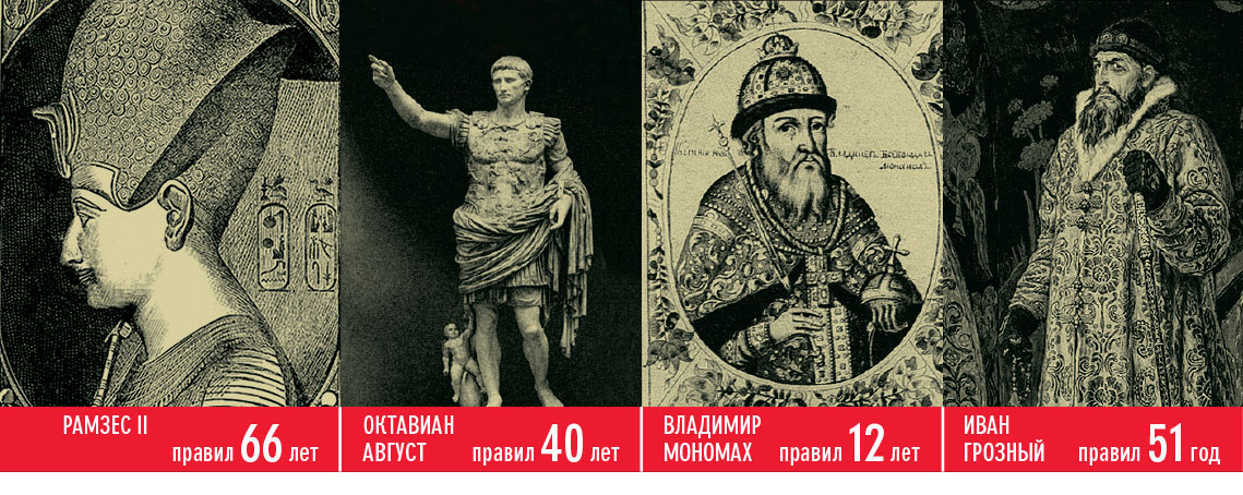 К числу первых в мировой истории монархов-долгожителей принадлежал правивший на рубеже XIV и XIII веков до н.э. египетский фараон Рамзес II, известный бесчисленным количеством жен и наложниц, а также тем, что при нем был заключен первый в мировой истории договор о разделе сфер влияния — между Египтом и Хеттским царством. Правление Рамзеса II длилось 66 лет***. Правивший на предыдущем рубеже тысячелетий — до и после Рождества Христова — царь Ирод I Великий (37 год до н.э. — 4 год н.э.) со своими 40 годами выглядит довольно скромно. Тем временем в Риме примерно столько же длилась эпоха принципата Октавиана Августа. Однако обычно большинство римских императоров правило недолго. Калигула, сделавший сенатором своего коня, находился у власти только четыре года, можно сказать, обычный срок правления американского президента. Только в отличие от большинства американских президентов, оставляющих свой пост на основании закона и свободных выборов, правление императора было прервано в результате заговора и убийства. Военные перевороты, устраиваемые придворной гвардией, — известный бич единоличных правителей, будь то в Древнем Риме, дворянской России или латиноамериканских республиках.