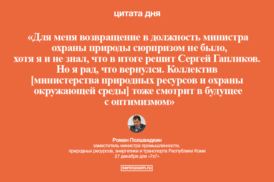 Перед новым годом в правительстве Коми произошли перестановки — глава республики Сергей Гапликов назначил нескольких чиновников на новые должности, они приступят к работе с января 2018 года. Об этом вечером 26 декабря сообщила пресс-служба правительства. Возрожденное министерство природных ресурсов и охраны окружающей среды снова возглавит Роман Полшведкин, руководивший им с ноября 2014 по октябрь 2016 года, пока толко в роли исполняющего обязанности. Сейчас он находится в должности замминистра промышленности, природных ресурсов, энергетики и транспорта региона.