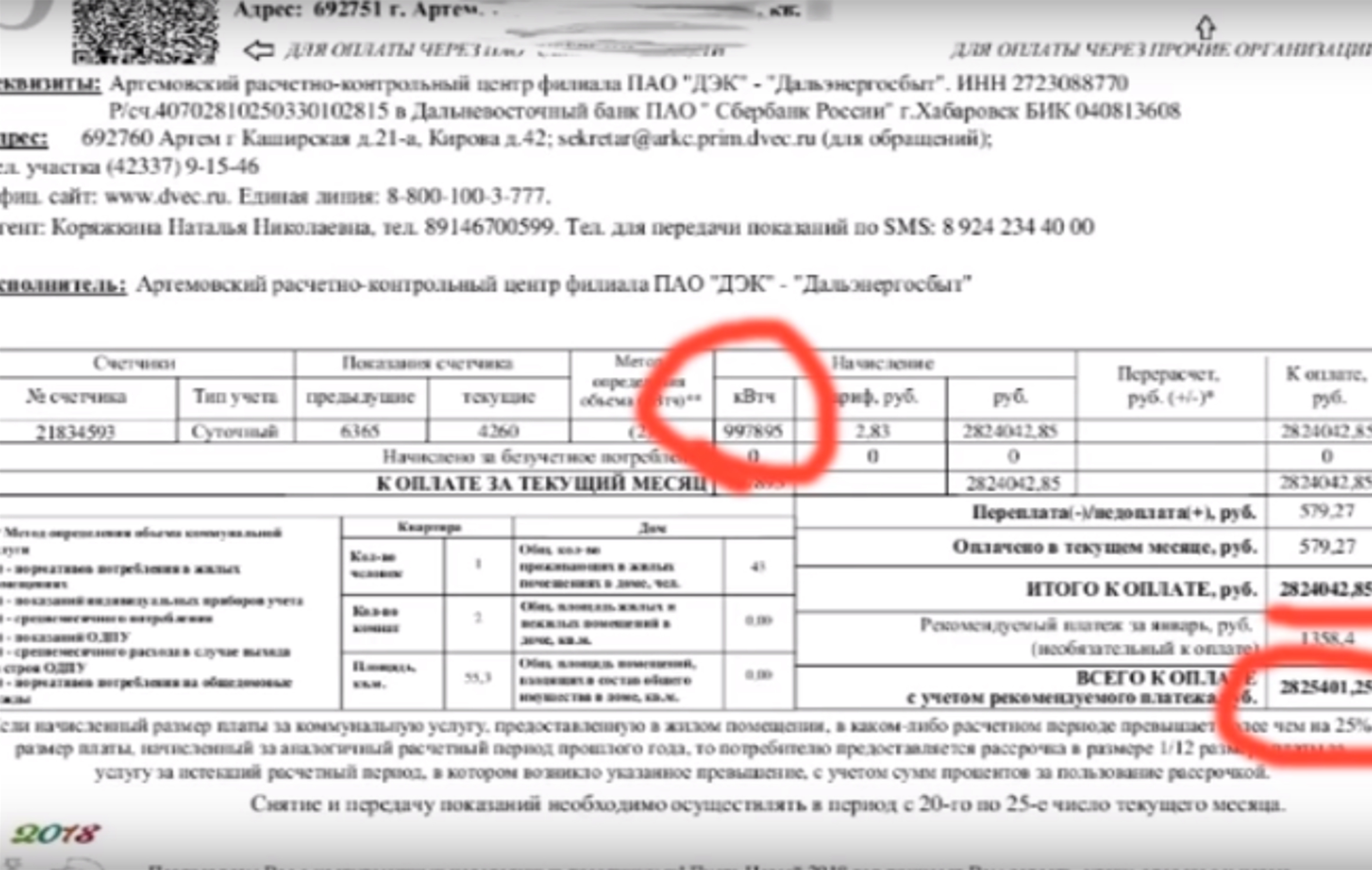 По данным ресурсоснабжающего предприятия, счета с ошибками получили 35 абонентов из приморского города Артем. На сайте энергокомпании в списке жителей, получивших неправильные квитанции, фигурирует счет на одного человека за потребление почти 100 миллионов киловатт-часов. Другая жительница Артема получила квитанцию на сумму почти в 3 миллиона рублей.
