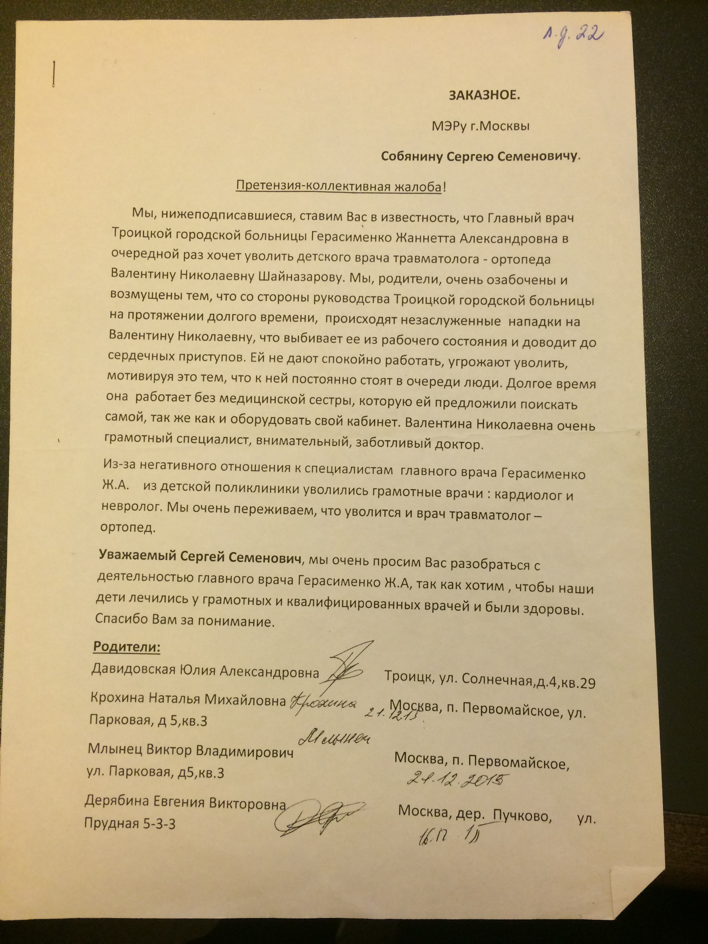 Шайназарова попыталась оспорить жалобу в Троицком суде. В удовлетворении иска ей отказали, апелляция также оставила решение без изменений. Шайназарову оштрафовали – удержали большую часть зарплаты – и объявили выговор. После этого, утверждает врач, сотрудники поликлиники стали намеренно срывать ее приемы: Шайназарову регулярно и надолго вызывали в кабинет главного врача, подсылали людей без записи, составляли на нее фиктивные жалобы: “Меня могли вызвать минут на сорок: мама только разденет малыша для осмотра, а мне уже стучат в дверь. Родители были в шоке. Почти каждый месяц стали удерживать зарплату якобы за жалобы. Когда я сказала пациентам, что меня, похоже, хотят уволить, они написали коллективное обращение на имя мэра Москвы, чтобы главный врач Жаннета Герасименко перестала оказывать на меня давление и дала спокойно выполнять свои обязанности”.
