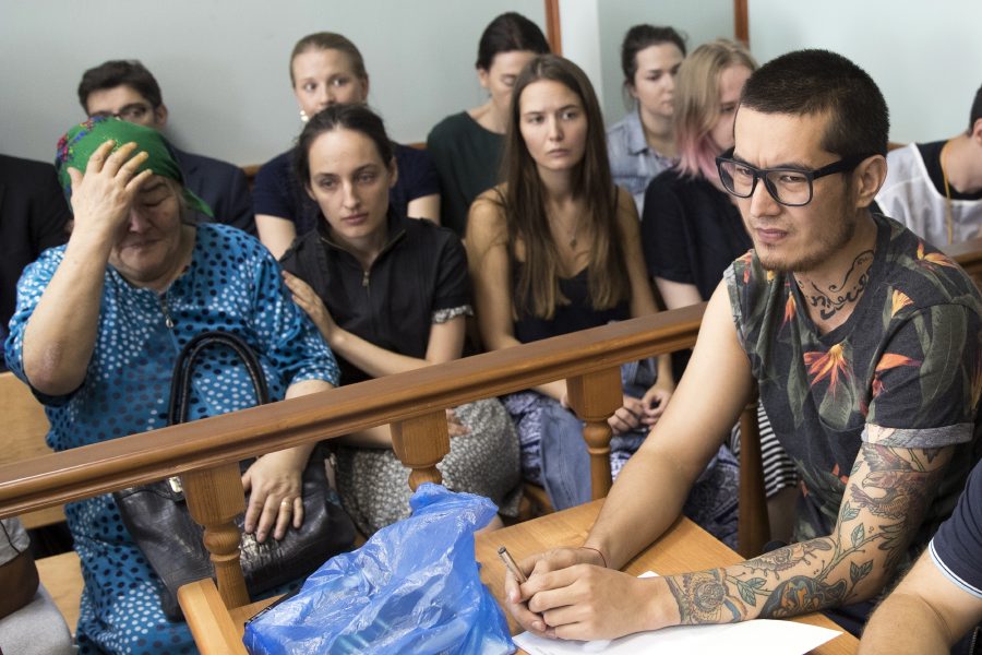 Корреспондент «Новой газеты» Али Феруз (справа) в зале суда. Московский городской суд приостановил исполнение решения Басманного суда о выдворении журналиста из России в Узбекистан до рассмотрения его жалобы в Европейском суде по правам человекаФото: Павел Головкин AP/ТАСС *