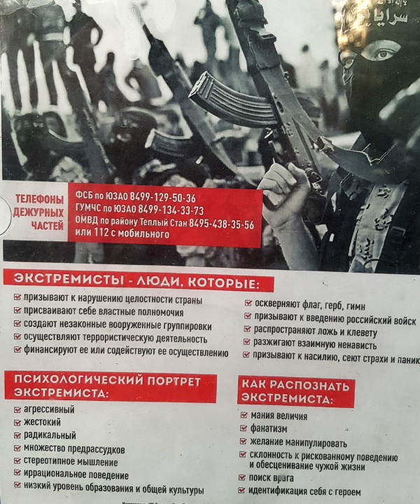 Пропаганда представляет экстремистов опасными людьми, которые в любой момент готовы перейти к терроризму. Плакаты, развешанные на информационных щитах в Москве, призывают граждан выявлять экстремистов по таким признакам, как желание манипулировать, мания величия, идентификация себя с героем, низкий уровень образования и культуры, склонность к рискованному поведению и обесцениванию чужой жизни.