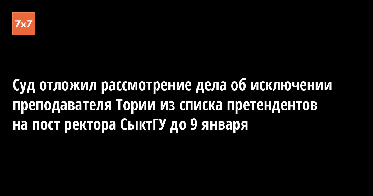 Сыктывкарский городской суд отложил на 9 января заседание по делу экс-декана юридического факультета Сыктывкарского государственного университета Риты Тории, которая оспаривает свой недопуск до выборов ректора вуза. Об этом сообщил корреспондент «7x7», присутствовавший в суде.