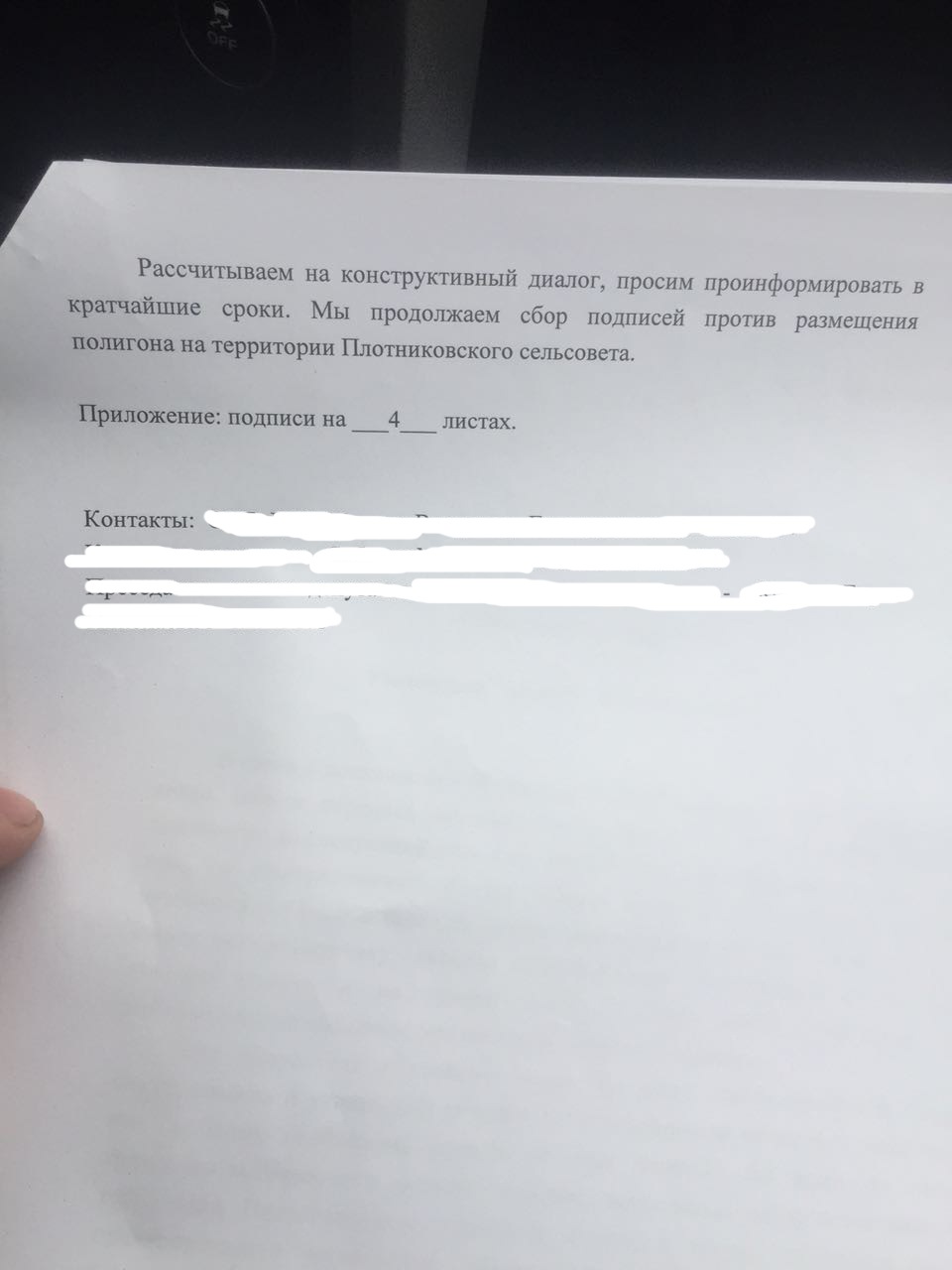 «Никакие чиновники, предлагающие Вам варианты, не знают территорию, ее специфику лучше нас, местных жителей», — говорится в обращении на имя Травникова. Участники схода подготовили 4 листа подписей против размещения полигона ТБО на территории Плотниково.