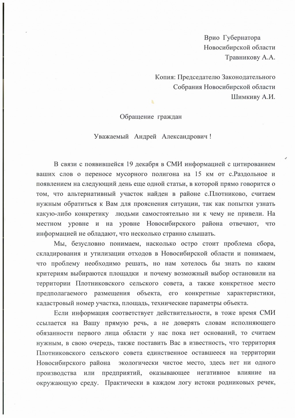 Тайга.инфо публикует обращение жителей Плотниково в адрес Андрея Травникова и Андрея Шимкива.