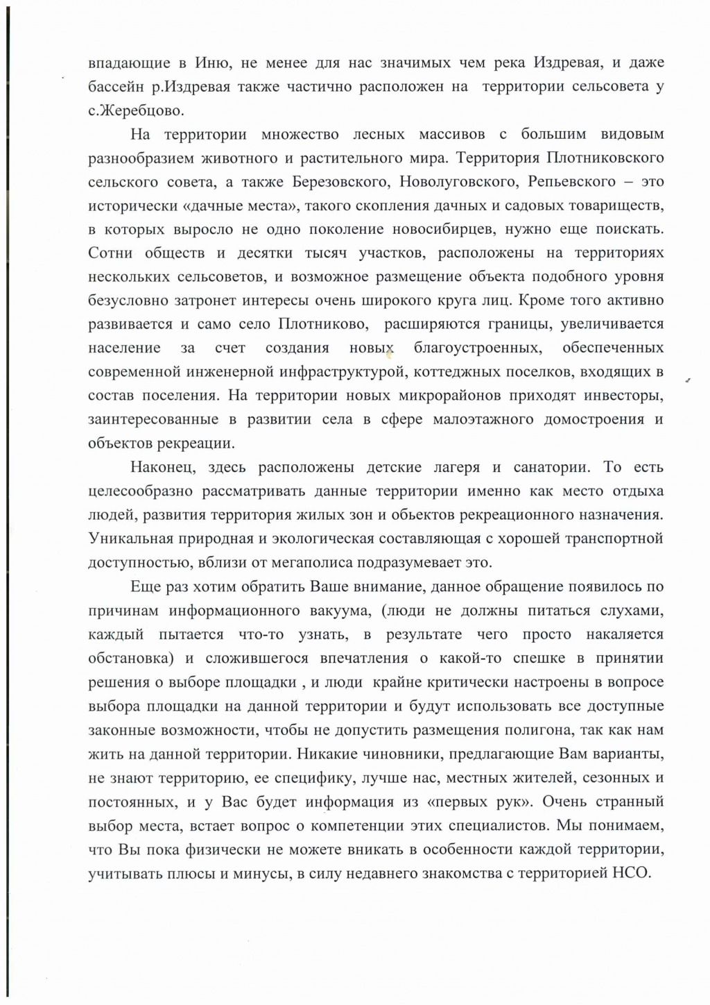 По словам участников схода, территория Плотниковского сельсовета — единственное экологически чистое место в Новосибирском районе, и там нет ни одного промышленного предприятия, загрязняющего окружающую среду. Кроме того, на этой территории расположено множество детских лагерей и санаториев, и размещение полигона ТБО крайне негативно скажется на их деятельности.