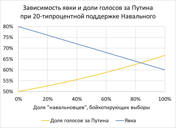Рисунок 3. Влияние "избирательной забастовки" на явку и результат Путина при 20-типроцентной поддержке Навального.