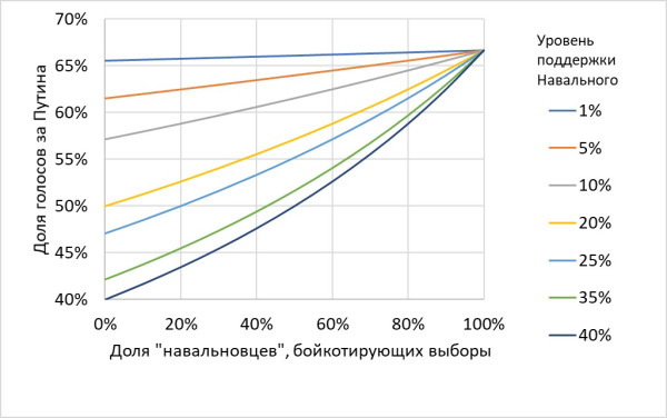 Рисунок 2. Доля голосов за Путина в зависимости от доли сторонников Навального, участвующих в избирательной забастовке, при разных предположениях о доле сторонников Навального среди избирателей.