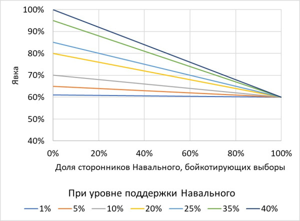 Рисунок 1. Зависимость явки от доли сторонников Навального, участвующих в избирательной забастовке (то есть, в бойкоте выборов), при разных предположениях о доле сторонников Навального среди избирателей.