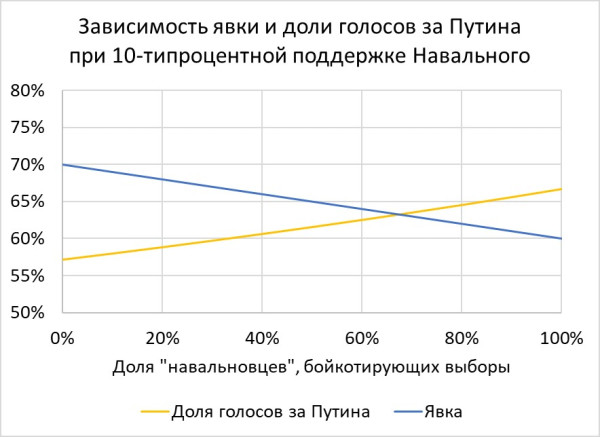 Рисунок 4. Влияние "избирательной забастовки" на явку и результат Путина при 10-типроцентной поддержке Навального.