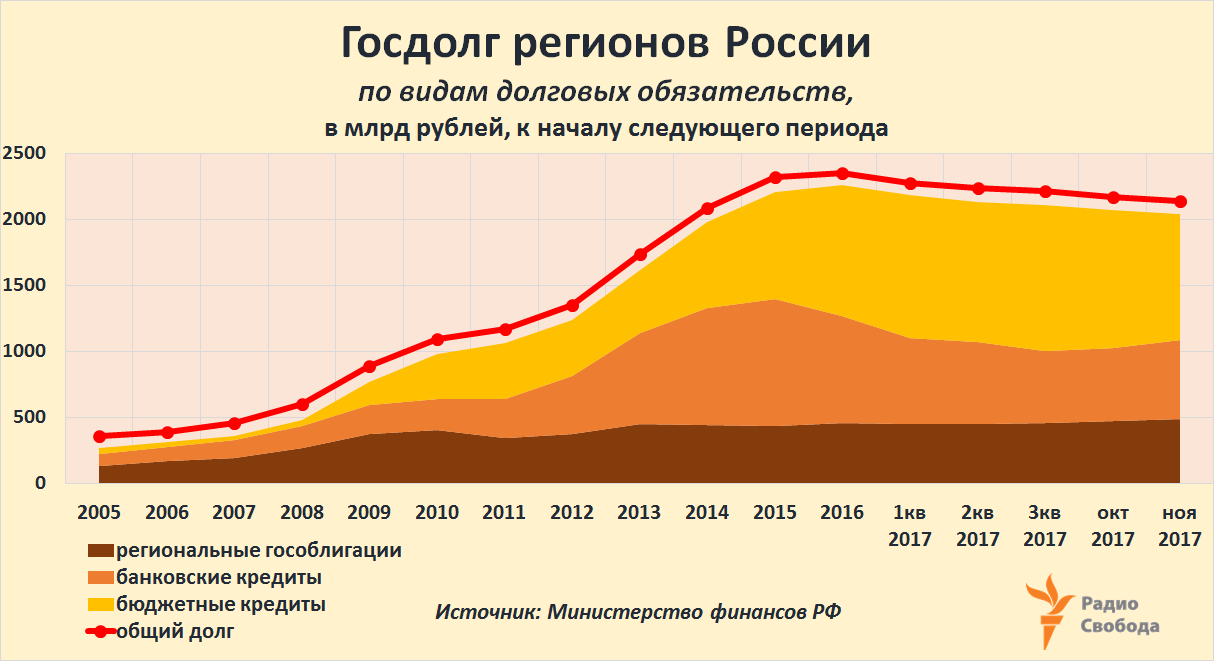 Source: официальный сайт ДА, НО... В 2017 году накопленный регионами государственный долг впервые за много лет не росВсего за 12 лет, с 2005 по 2016 год, общий накопленный регионами России государственный долг вырос в 6,5 раза. И только за последние из них пять лет – более чем вдвое. Это следствие выполнения “майских” указов президента [от 2012 года], поясняет в интервью Наталья Зубаревич, директор региональной программы Независимого института социальной политики: