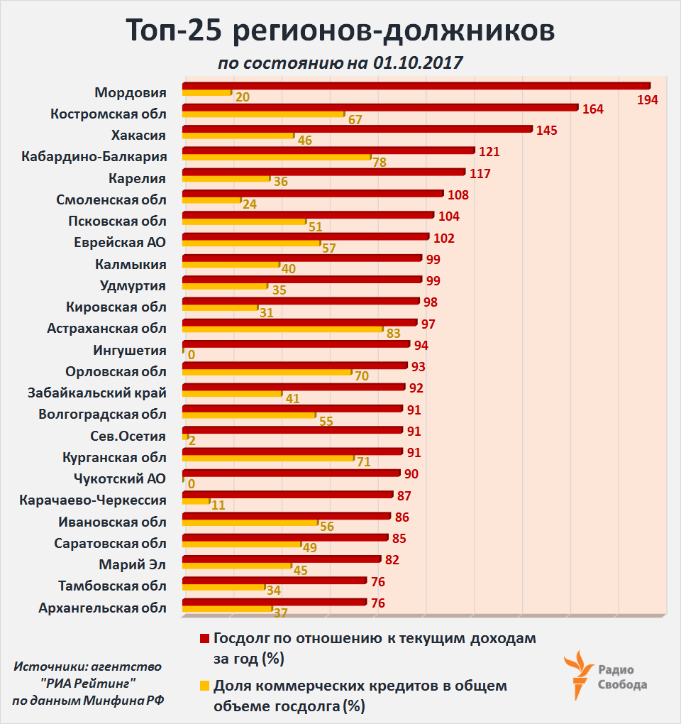 К началу октября 2017 года количество российских регионов с накопленным госдолгом, превышающим 80% их годовых доходов, сократилось до 23, а тех, в которых долг превышает половину доходов, – до 47. При этом в восьми регионах долг превышает 100% всех их текущих доходов за год. Об этом свидетельствует очередной рейтинг регионов России по уровню долговой нагрузки, который регулярно представляет агентство “РИА Рейтинг”. Для сравнения, этот же показатель в среднем по России – 30%, а доля коммерческих кредитов в общей структуре регионального госдолга составила в среднем по всем регионам 24%: