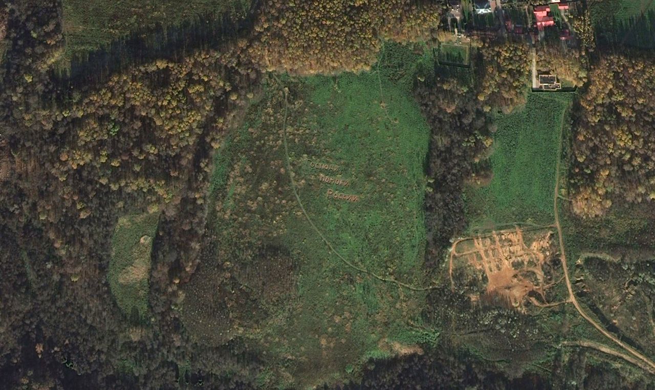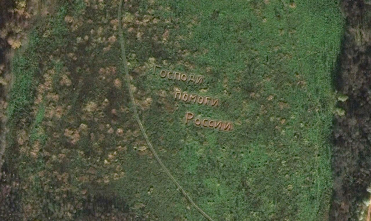Авторы телеграм-канала «Код Дурова» обнаружили, что на поле, расположенном недалеко от села Рождествено в районе Митино, сделана огромная надпись «Господи, помоги России». Надпись настолько большая, что ее видно на спутниковых картах Google и «Яндекс». На Google Maps объект отмечен как туристический.