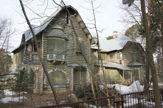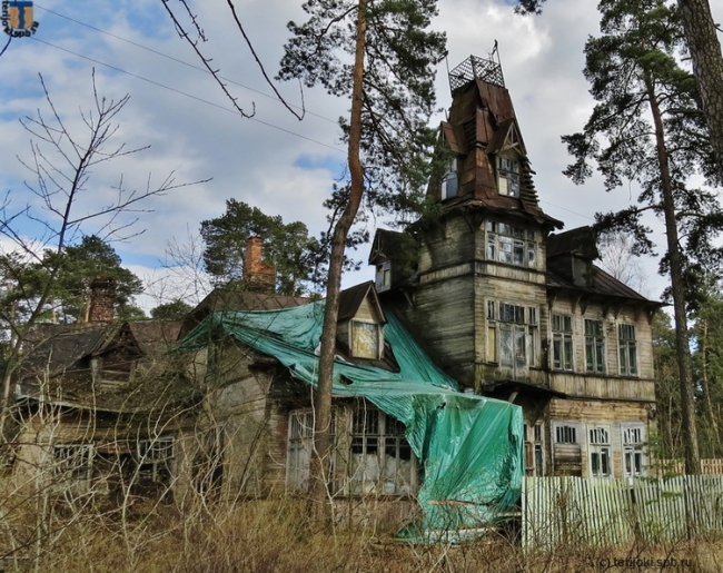 Дача Важеевской – этому памятнику эпохи модерна Концепцией предписано стать «Избой непотерянного просто так времени». Пятый год стоит с поврежденной после пожара кровлей, с 2014 г. КГИОП фиксирует следы протечек и поражение черной плесенью