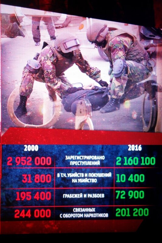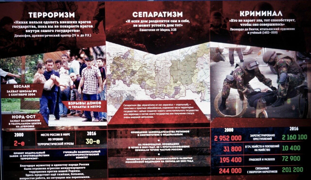 Однако целый ряд стендов предупреждают: мы живем в окружении внешних угроз. Тут и экономический кризис, и цветные революции. Акции белоленточников - неудачная попытка такого переворота в России. Отдельно выделен переворот на Украине.
