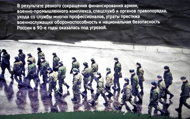 1990-гг. - только нарастающий хаос, организуемый своими реформаторами при поддержке Запада. Результат реформ - тотальный кризис общества, в котором бросается в глаза фокус на развале армии, спецслужб, ВПК, падение роли России в геополитике.