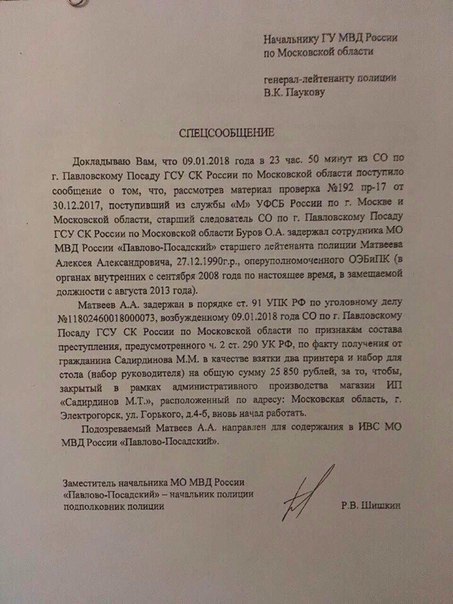 В спецсообщении за подписью заместителя начальника МО МВД «Павлово-Посадский» Романа Шишкина, фото которого опубликовано в паблике «Омбудсмен полиции», говорилось, что материалы в отношении старшего лейтенанта Алексея Матвеева были переданы из ФСБ. Шишкин писал, что Матвеева задержали по признакам преступления по части 2 статьи 290 УК.