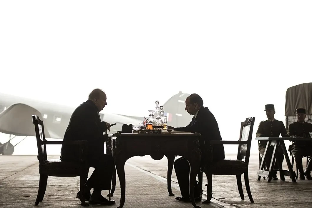 Недавно смотрели нолановский «Дюнкерк» — захватывающую драматическую и поэтическую историю эвакуации тысяч британских солдат с береговой линии — «на общем плане». С воздуха видели понурых военных на пляже, в длинных очередях ждущих решения своей участи, взрывы на пляже, трупы на пляже. А в облаках британцы бились с «мессерами», бомбящими мирные суда-спасатели. В «Темных временах» — та же история спасения армии, когда по приказу Черчилля началась операция «Динамо». В залив со всей Англии отправилась необычайная армада: частные яхты, рыбачьи шхуны, катера и утлые суденышки. Но Райт концентрирует внимание на крупных планах политиков.