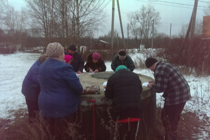 Жители Торфяновки получают пенсию на улице, заполняя квитанции на канализационном люке