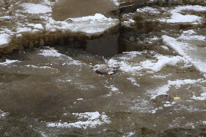 Чайка всё это время сидела неподвижно. При температуре между плюсом и минусом птицы часто попадают в такие ситуации, вмерзая в лед. Возможности выбраться оттуда у них нет.