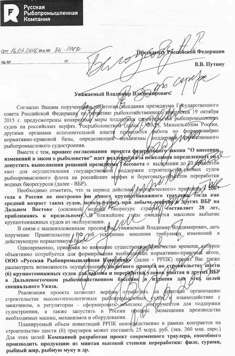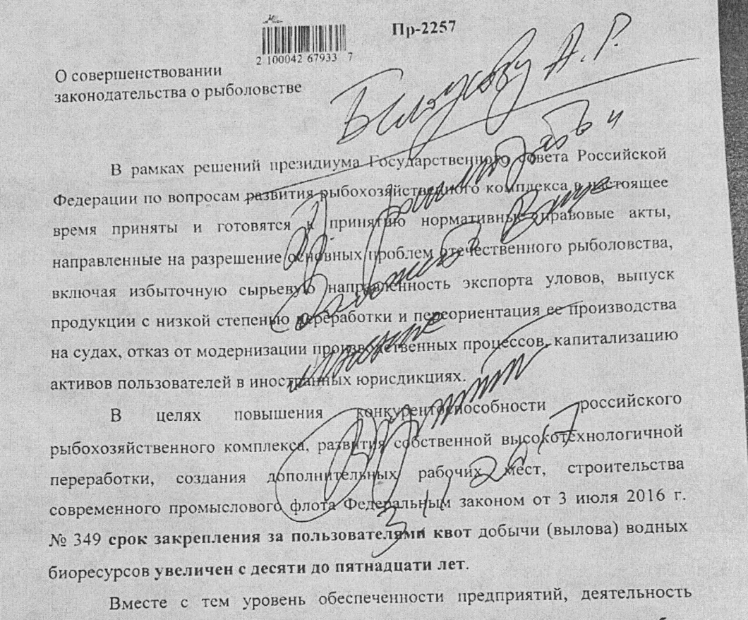 В конце ноября прошлого года в «Коммерсанте» было опубликовано поручение президента России Владимира Путина своему помощнику Андрею Белоусову: «Прошу рассмотреть и доложить ваше мнение». Поручение было оформлено в виде резолюции, нанесенной на письмо «О совершенствовании законодательства о рыболовстве», в котором неизвестный автор (обращение без подписи) предложил пересмотреть принцип распределения квот на вылов краба. Поручение датировано 3 ноября 2017 года.