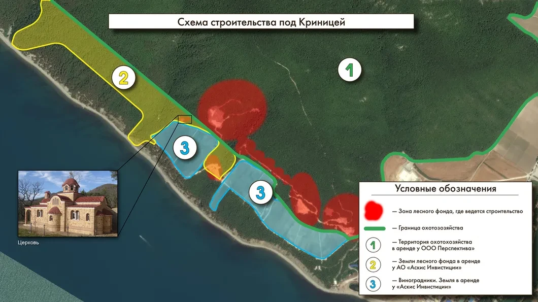 Церковь граничит с виноградниками — два участка сельхозземель площадью 5,6 и 12 гектаров АО «Аксис Инвестиции» арендовала годом позже. По словам Савельева, «одни и те же заборы окружают и виноградники, и изуродованный и захваченный лес».