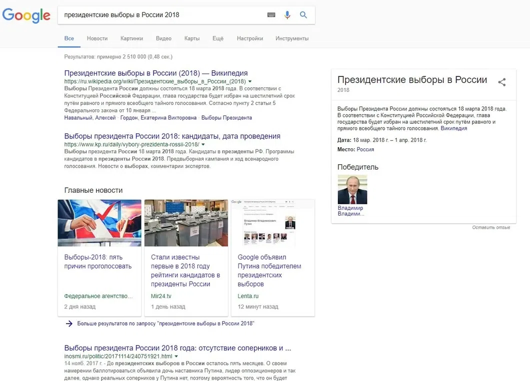 Поисковый сервис Google при выдаче результатов поиска по запросу «президентские выборы в России 2018» называет победителем голосования действующего президента Владимира Путина.