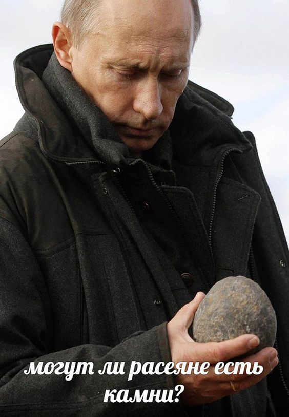 Возможно, это отсылка к мему «Могут ли россияне есть камни?»; он стал популярным осенью 2017 года. Сам мем — это фотография 2010 года, на которой задумчивый Путин держит камень.