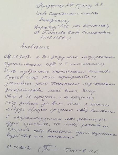 "09.01.2018 года я был задержан сотрудниками Курчалоевского ОВД, и в мою машину было подброшено наркотическое вещество. Против меня было сфабриковано уголовное дело. Полностью подтасованы доказательства моей вины. Вину свою я не признал и не признаю. Хочу довести до Вас, если я каким-нибудь образом признаю себя виновным в инкриминируемом мне деянии, это будет означать, что меня заставили признать себя виновным путем физического воздействия или шантажом", - говорится в документе.
