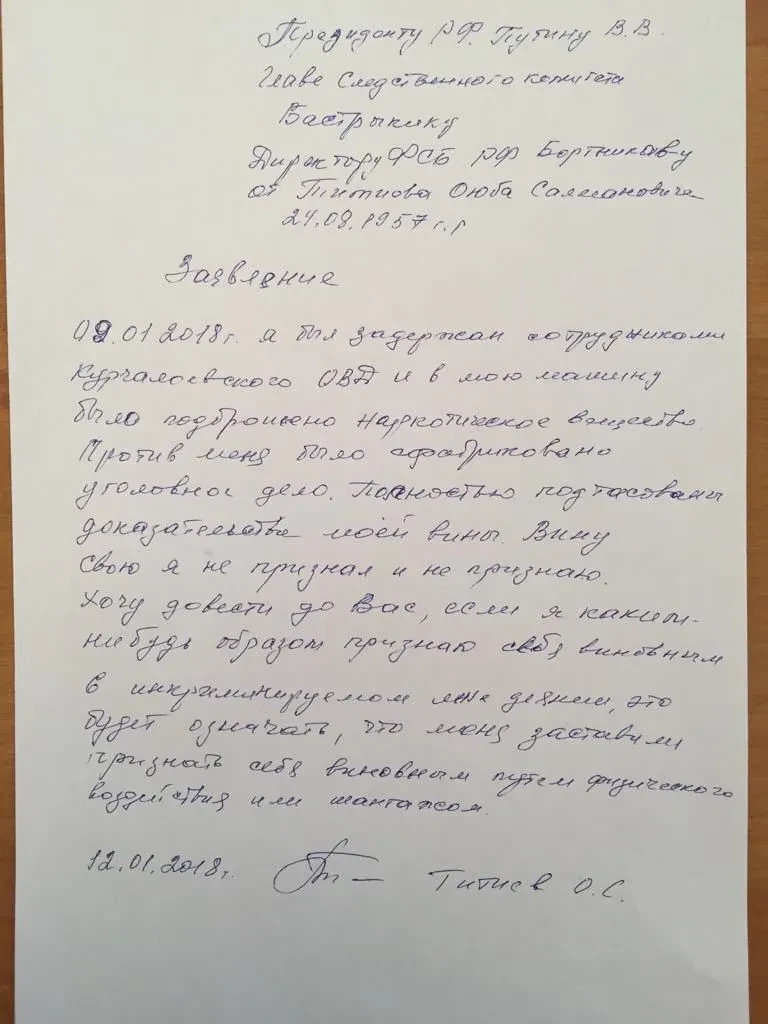 «09.01.2018 г. я был задержан сотрудниками Курчалоевского ОВД, и в мою машину было подброшено наркотическое вещество. Против меня было сфабриковано уголовное дело. Полностью подтасованы доказательства моей вины. Вину свою я не признал и не признаю. Хочу довести до Вас, если я каким-нибудь образом признаю себя виновным в инкриминируемом мне деянии, это будет означать, что меня заставили признать себя виновным путем физического воздействия или шантажом».