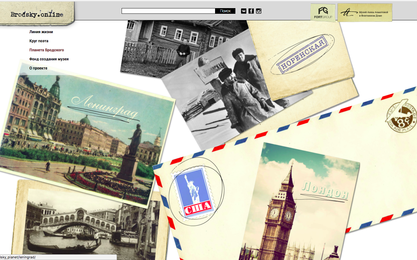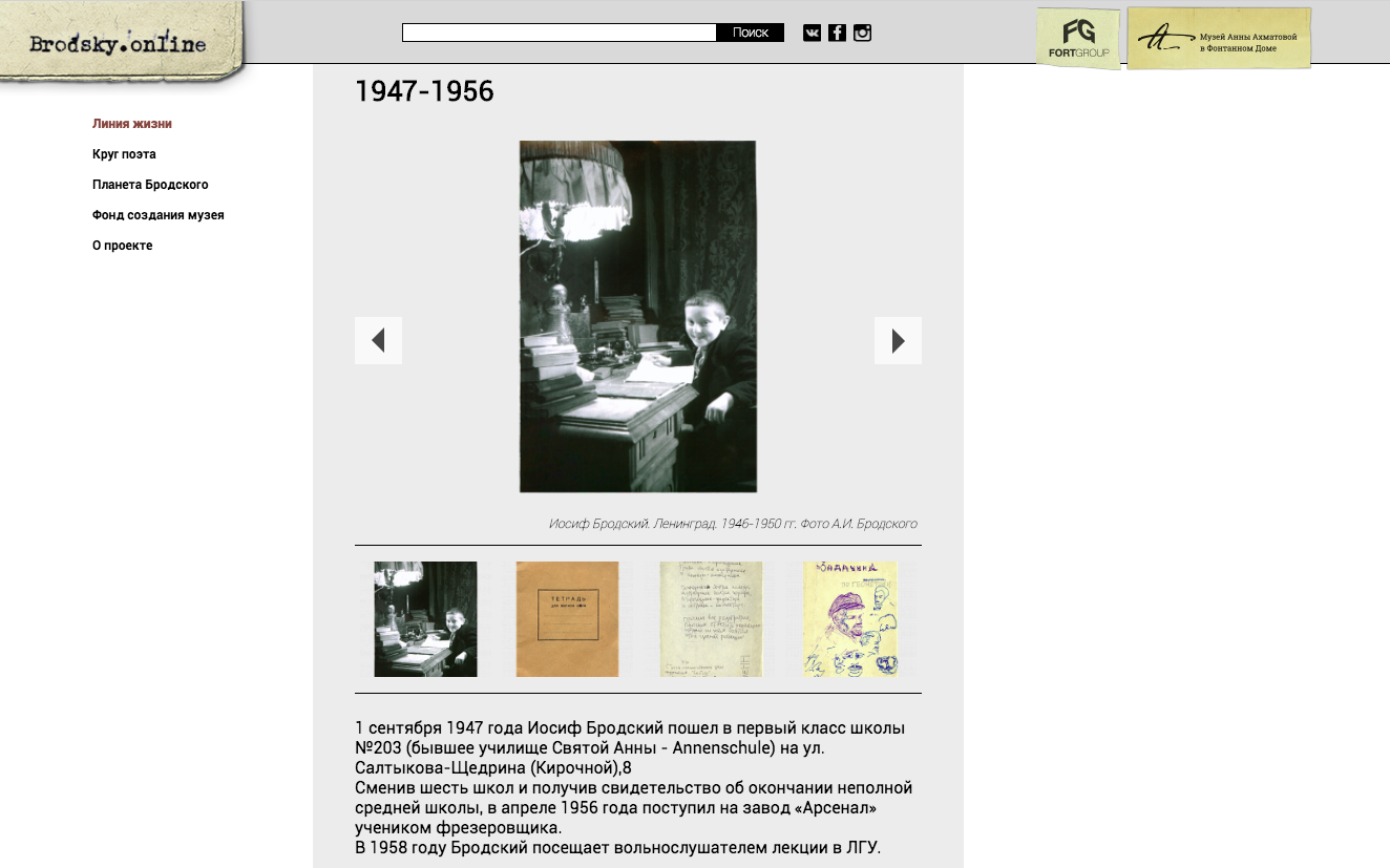 В начале декабря заработал проект Brodsky.online — виртуальный музей, посвященный поэту Иосифу Бродскому. На сайте собраны документы и записи поэта — например, школьные тетради и план его комнат в доме Мурузи на Литейном проспекте, 24, а также рассказы о разных периодах его жизни. Кроме того, на ресурсе есть автобиографические справки о друзьях и знакомых литератора.