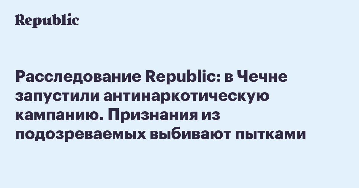В рамках антинаркотической кампании, запущенной в Чечне, сотрудники правоохранительных органов пытками заставляют задержанных признаваться в употреблении запрещенных веществ (как правило, марихуаны). Об этом говорится в расследовании Republic.