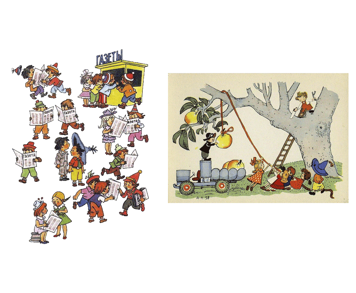 И совсем уж взрослым оказывается мир третьей книги, неожиданно приобретшей статус культовой в постсоветской России, — «Незнайки на Луне», народной энциклопедии капитализма. Начнем с того, что там почти полностью исчезает слово «малыш» / «малышка» — на весь роман это именование встречается всего один раз, в самом начале. Отметим, что в первой книге это слово употреблено 378 раз, а во второй 86. Взросление мира Носова отражается на уровне лексики!
