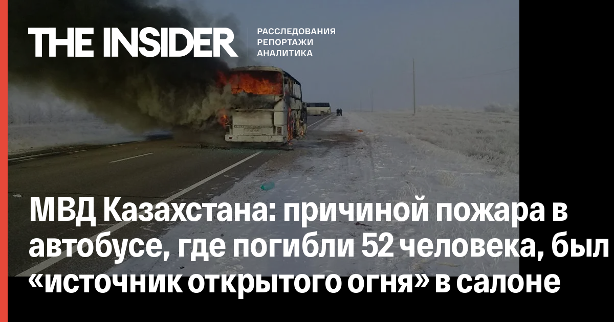 Причиной пожара в пассажирском автобусе в Казахстане, в результате которого погибли 52 человека, был «бензиновый источник открытого огня в салоне». Об этом сообщает «Интерфакс» со ссылкой на МВД Казахстана.